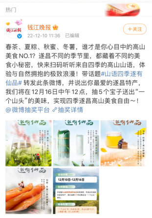 遂昌不同的季节里,都藏着不同的“高山山语”,采茶声、煮长粽的水声、蜜蜂采蜜的声音……无不动人心弦。为了更好地宣传遂昌文化、推广特色农产品,遂昌以“山语四季,遂有仙品”作为推广宣传语,筹备锦鲤抽奖活动,将“转发送遂昌特产”、“承包你的高山美食自由”作为福利点,吸引公众,聆听遂昌四季高山山语,同时介绍“春茶、夏粽、秋蜜、冬薯”四季仙品,激发了消费者的参与热情,也引发了公众对遂昌农产品的关注。