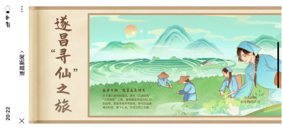 为了呼应高山山语的故事,遂昌新闻公众号以“寻仙之旅”为主题,用优美的长图勾勒出遂昌的四季风光和各季美食,春天采收龙谷茶,夏季摘取“药王”三叶青,秋天煮好遂昌长粽,冬日收割高山野蜂蜜,每一个季节,都可以点击长图的对应区域,聆听美食之声,用这种年轻人喜欢的svg互动推文形式,让读者更能沉浸式体验到遂昌仙境仙品。