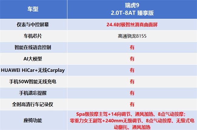 日常带娃出门玩,节假日带全家人出门旅行,家庭用户想要获得更畅快的出行体验,光有空间肯定不够,配置表现也是非常关键的一点。瑞虎9配有Spa级按摩主驾,搭配零重力女王副驾,不仅让长处出行中的驾驶者更舒适,就连副驾驶的伴侣也能得到更好的照顾。
