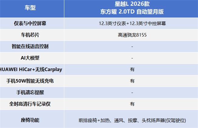 相比之下,星越L车内也配有前排座椅+加热、通风、按摩等座椅功能,但不支持多向调节与无极调节。同时,它配备了12.3英寸仪表以及12.3英寸中控屏,内置8155车机芯片,支持HUAWEI HiCar,无线Carplay、手机50W无线充电等功能,但未内置AI大模型,虽然能满足用户基础的舒适性与智能化需求,但仍有一定的提升的空间。