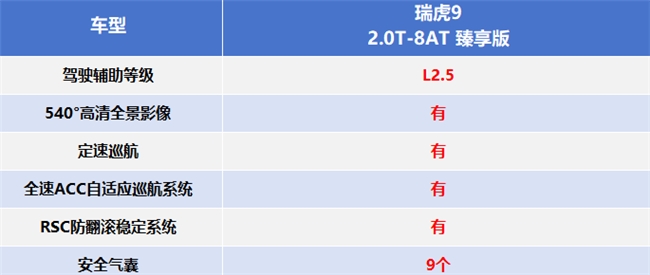 对于家庭用户来说,全员安全一定是幸福出行的基础。瑞虎9采用全球五星安全标准设计,磐石车身高强度钢占比达85%,配合双防撞梁+6吸能盒、乘员舱6条传力路径等设计,可以为用户带来全方位的安全保护。而同级唯一环抱式10安全气(含同级独有远端气囊)更是对安全进行了进一步“加码”(臻享版为9安全气囊),全面提升了“安全底线”。另外,这款车还全系标配了L2.5级智能驾驶辅助,21项主动安全配置,让用户安全感“拉满”。