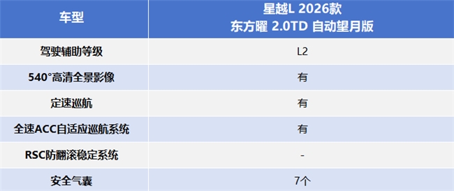 而星越L同样支持L2级驾驶辅助系统,内置全速ACC自适应巡航系统、FCW前方碰撞预警、AEB自动紧急制动、540°高清全景影像等功能,但在驾驶辅助功能的配置丰富性上有所欠缺,如它并未配置RSC防翻滚稳定系统,可能会给用户在面对复杂用车场景时带来一定局限性。
