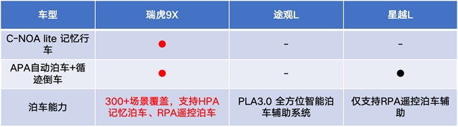 对比来看,途观L在智能泊车领域正快速提升,PLA3.0全方位智能泊车辅助系统功能可圈可点,但在面对极限窄位时,缺少遥控泊车功能有时会让用户能停车但无法下车。而星越L APA智能泊车辅助、RPA遥控泊车辅助均有配备,唯独缺少记忆泊车,在功能丰富度、泊车场景覆盖上稍逊一筹。