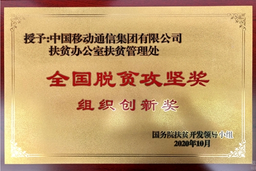 截至2020年8月,中国移动总部已帮扶6个县脱贫摘帽,所属单位帮扶4个县、12个乡、1756个村脱贫摘帽,共帮助超过100万贫困人口脱贫。中国移动连续两年在中央单位定点扶贫考核中获最高等级评价、2019年排名中央企业首位,2019年、2020年先后获得全国脱贫攻坚奖贡献奖、组织创新奖,自主开发的精准扶贫系统先后被联合国评选为“信息社会世界峰会最高项目奖”和“全球减贫案例”。